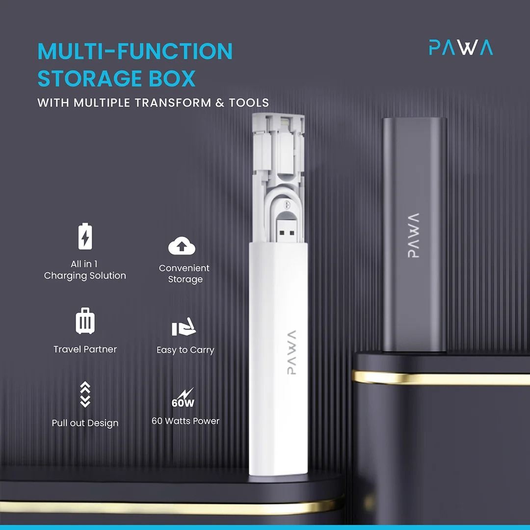 کابل تبدیل پاوا مدل Multi-Function Storage Box بهصورت یک محصول چندکاره طراحی شده که میتوانید از آن برای موقعیتهای مختلف استفاده کنید. تمامی تبدیل های زیر را میتوانید در این مجموعه به صورت یکجا داشته باشید. قابلیت تبدیل به کابل USB به Lightning / قابلیت تبدیل به کابل USB به micro USB / قابلیت تبدیل به کابل USB به Type-C / قابلیت تبدیل به کابل Type-C به Lightning / قابلیت تبدیل به کابل Type-C به Type-C / قابلیت تبدیل به کابل Type-C به micro USB / امکان درآوردن سیم کارت از گوشی یا تبلت با استفاده از سوزن سیم کارت در محصول / قابلیت نگهداری و جلوگیری از گم شدن سیم کارت و کارت میکرو اس در محفظه مخصوص . خروجی که از این کابل به دستگاههای مختلف منتقل میشود ، 60 وات است؛ یعنی اگر آن را به یه آداپتور وصل کنید، یک کابل type-C به type-C که آنرا به تمامی موارد بالا که اعلام کردیم میتوایند تبدیل کنید. همیشه و در هر مکانی بین خانواده یا دوستان گوشی های مختلف و اکسسوری های مختلف با ورودی های مختلف وجود دارد و بسیار پیش می آید که کسی از آن ها کابل خود را فراموش کرده باشد و با داشتند این دستگاه از پاوا مدل Multi-Function Storage Box میتوانید ناجی آن ها باشید.
